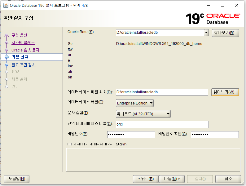 7. 위 아래 주소 동일, 하단의 컨테이너 체크 금지, 오라클 비번 설정!!!!