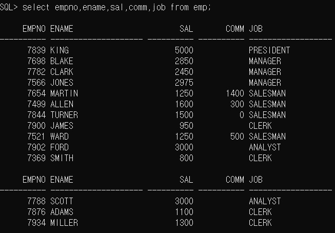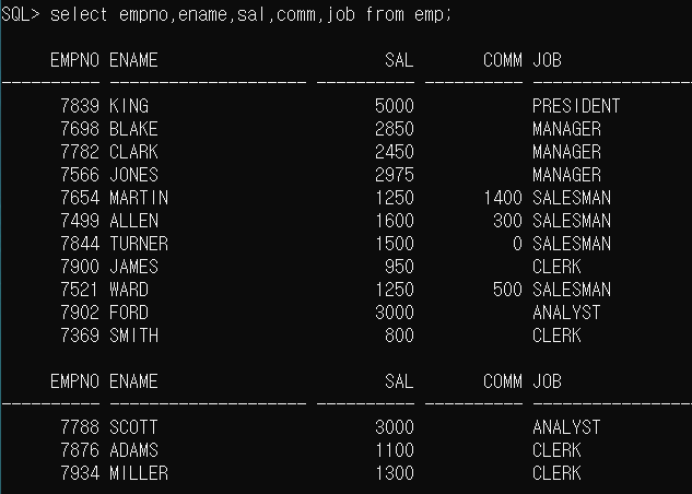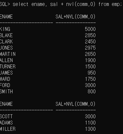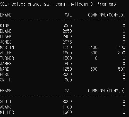 -> select ename,eval, comm, nvl(comm, 0) from emp;