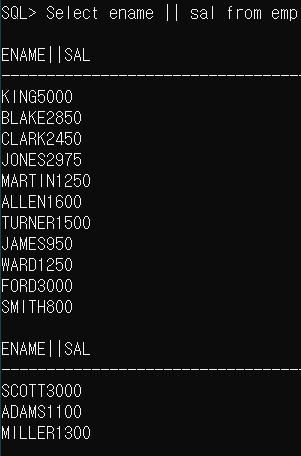 - 연결 연산자 || : 두 개의 컬럼의 데이터를 서로 연결해서 출력할 때 사용하는 키워드