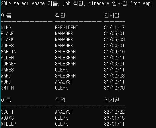 -> Select ename 이름, job 직업, hiredate 입사일 from emp;