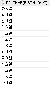 Ex) select ename, to_char(birth,'day') from emp11;