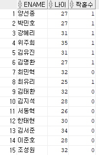-> select ename, age, mod(age,2) from emp11;