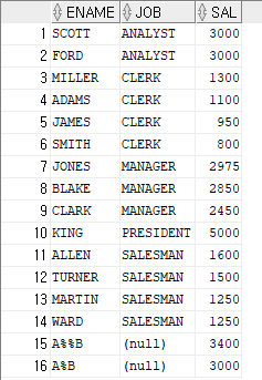 -> select ename, job, sal from emp11 order by job asc, sal desc;