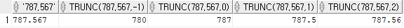 -> select '787.567', Trunc(787.567,-1), Trunc(787.567, 0), Trunc(787.567, 1), Trunc(787.567, 2) from dual;