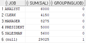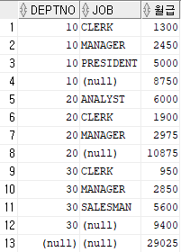 -> select deptno, nvl(job,'부서토탈'), sum(sal), grouping(deptno), grouping(job) from emp