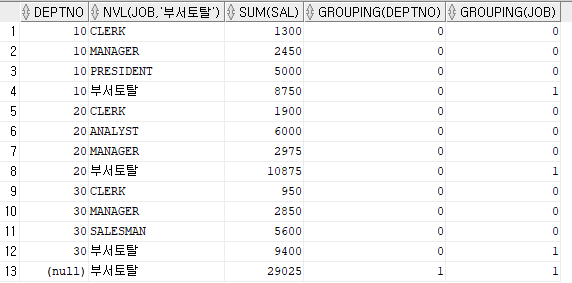select deptno, nvl(job,'부서토탈'), sum(sal), grouping(deptno), grouping(job)