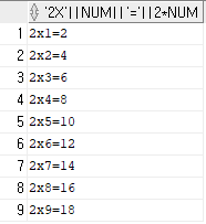 select num1||'x'||num2||'='||num2 * num1 from temp_table1, temp_table2;