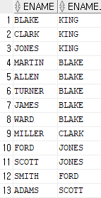 Select e.ename, d.ename from emp e, emp d Where e.mgr = d.empno;
