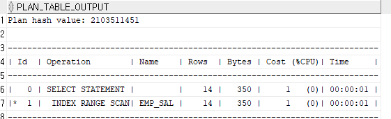계획 순서는 2 -> 1 -> 0 순이며 INDEX RANGE SCAN이라는 것을 확인할 수가 있다.
