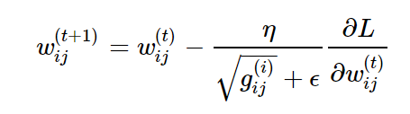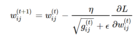 각각의 파라메터보다 적절한 learning rate를 적용시킨다는 장점이 adagrad의 장점이지만, 학습 횟수가 점점 많아질 수록, g값이 커지기 때문에, learning rate는 계속 작아질 수 밖에 없고 가중치 업데이트가 안된다. 이를 보완한 것이 rmsprop과 adadelta이다.