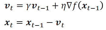 식을 풀이하면 과거의 이동 벡터 Vt-1 를 기억하고 이데 대해 관성을 곱해준 후, 기울기를 이용한 이동 step 항을 더해준다.