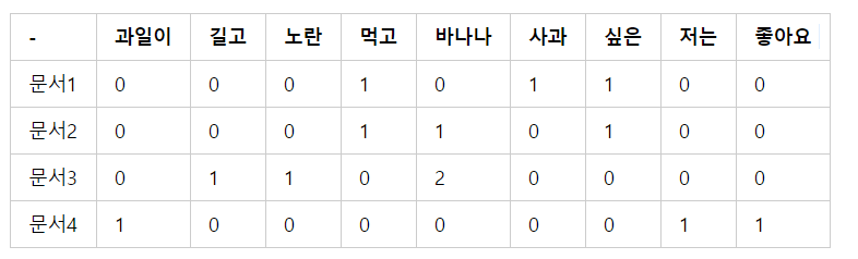각 문서에 등장한 단어의 빈도를 행렬값으로 나타냈으며, 서로 비교가능한 것이 장점이다.