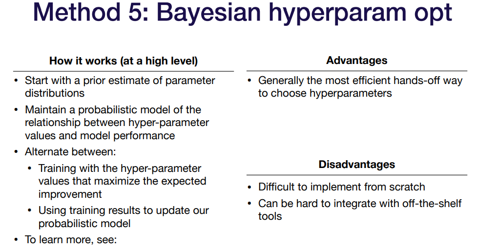 다른 방법으로는 베이지안 추정을 통하여 파라메터 튜닝을 하는 것이다. 매개변수와 모델 성능 사이에 확률 모델을 유지하여, Expectation을 최대화 하는 파라메터 값을 사용해서 튜닝을 하는데, 매우 간편하고 효율적인 선택방법이라고 한다.