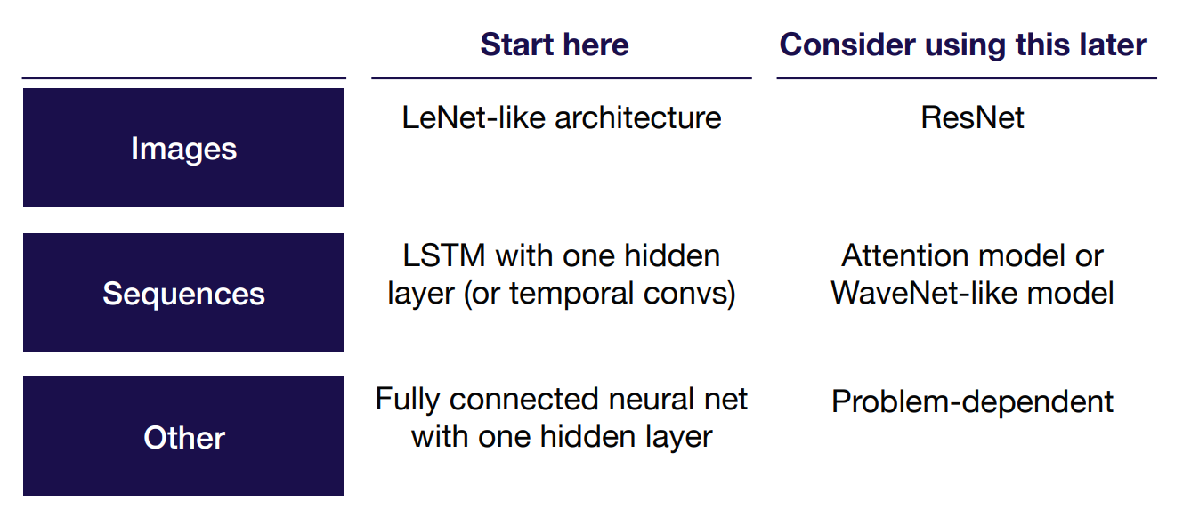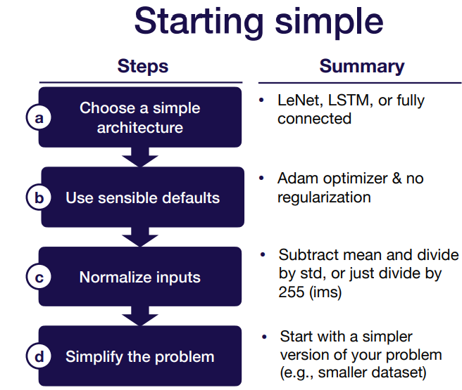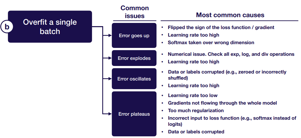 이런 것들을 알아채고 해결하기 위해서는 디버깅을 해야하는데, 모델을 처음 돌릴 때는 아래의 그림에 나와있는 사항들을 체크해보자. 데이터의 특성 및 하드웨어적인 부분을 고려하지 않을 때 흔히 발생하는 것들인것 같다.
