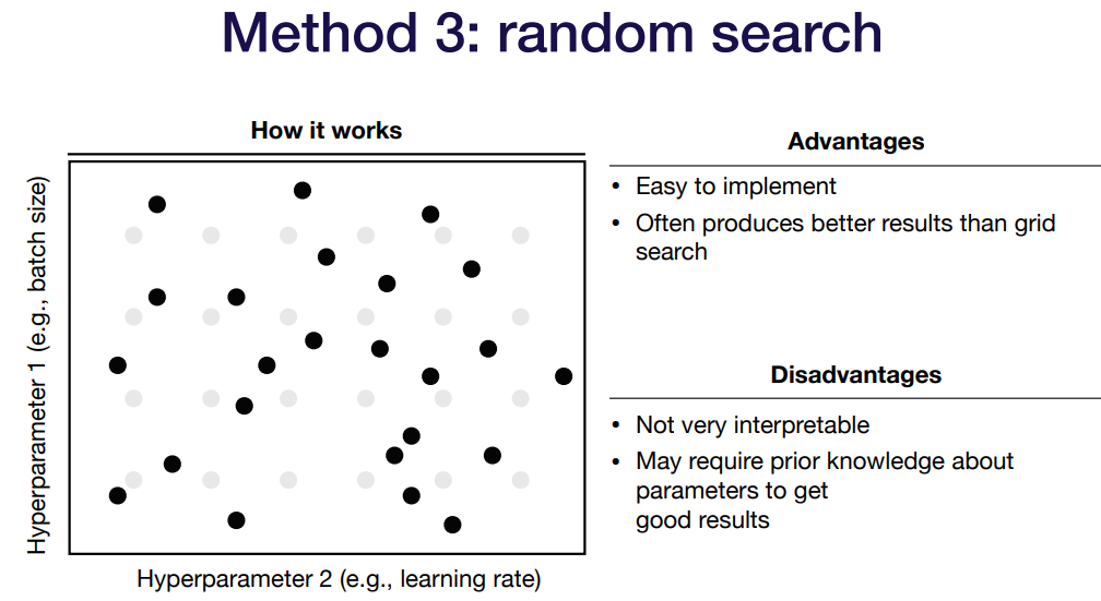 파라메터를 찾는 방법 중 하나로 random search가 보통 효율적이라고 말하는데, N개의 point를 랜덤으로 선택해서 튜닝하는 방법으로 효율성인 부분에서는 그리드 서치보다 좋지만, 가끔 해석 불가능한 파라메터 조합으로 설명이 불가능 할 때가 있다.