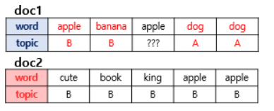 doc1의 3번째 apple의 토픽은 B로 볼 수가 있다.