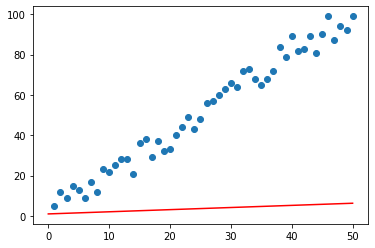 print(f"epoch {i} loss : {loss.item()} weight : {model.linear.weight.item()} bias: {model.linear.bias.item()}")